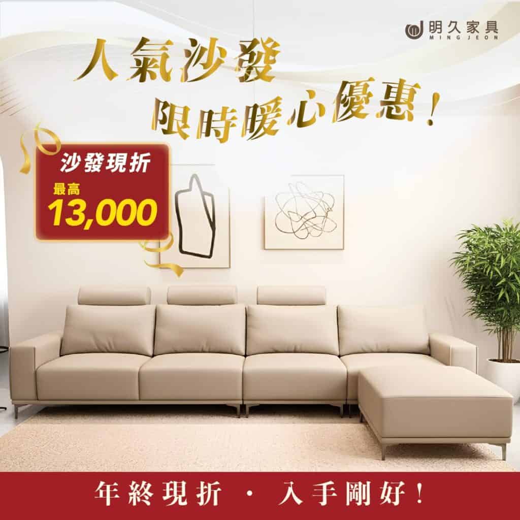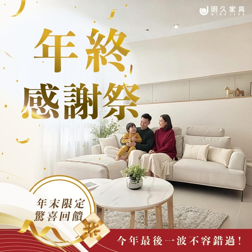 年末將至,明久家具推出年度最強優惠回饋。想趁這波把心儀家具帶回家,跟家人一起舒舒服服迎接新年的話,這檔活動值得把握。