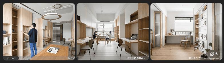 - 櫃體牆體化:系統櫃、收納櫃沿牆延伸並作為分隔意象,替代實體隔間。 (設計家 Searchome)