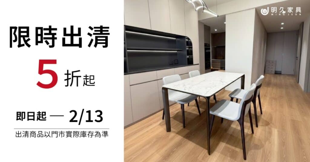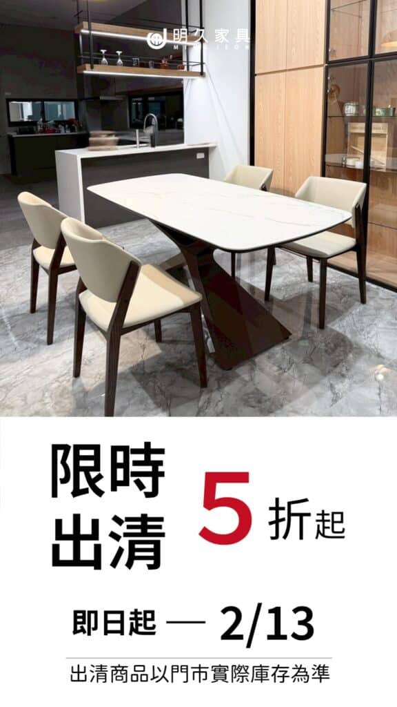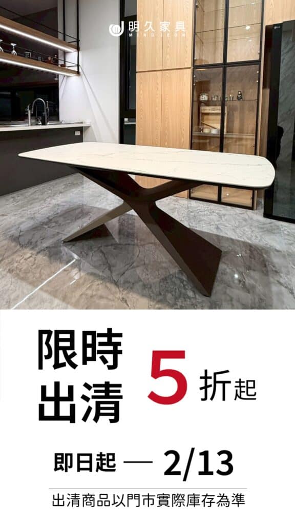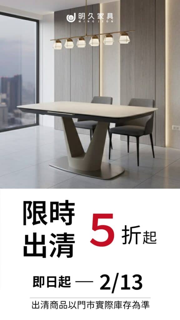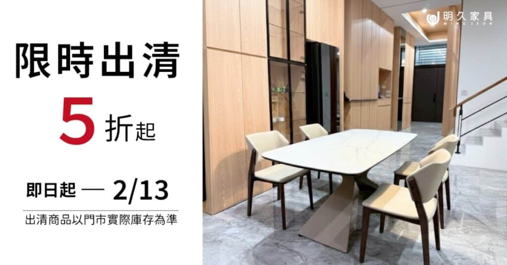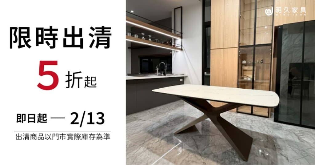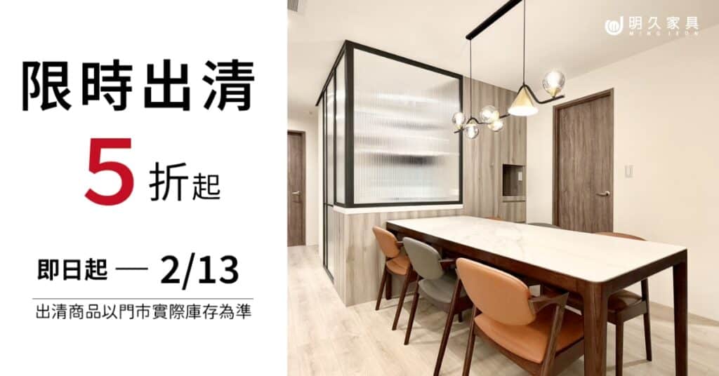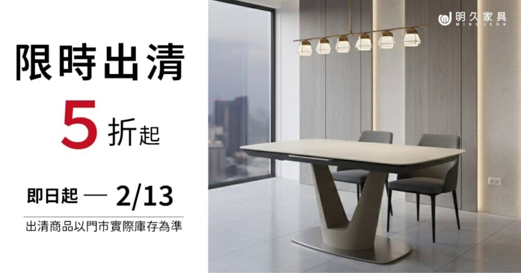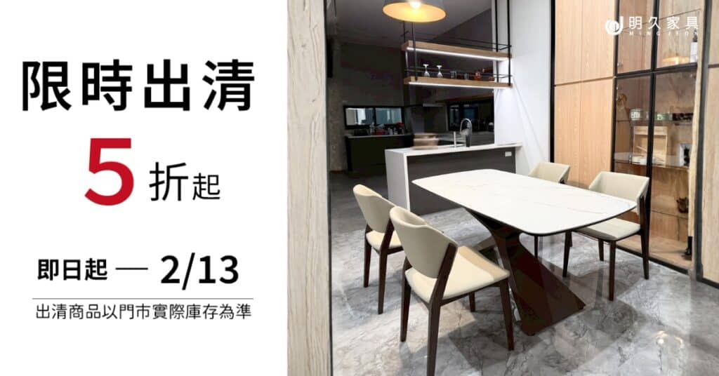 明久家具限時出清活動從即日起至 2026 年 2 月 13 日,全館商品 5 折起。商品以門市實際庫存為準,建議提早前往挑選。