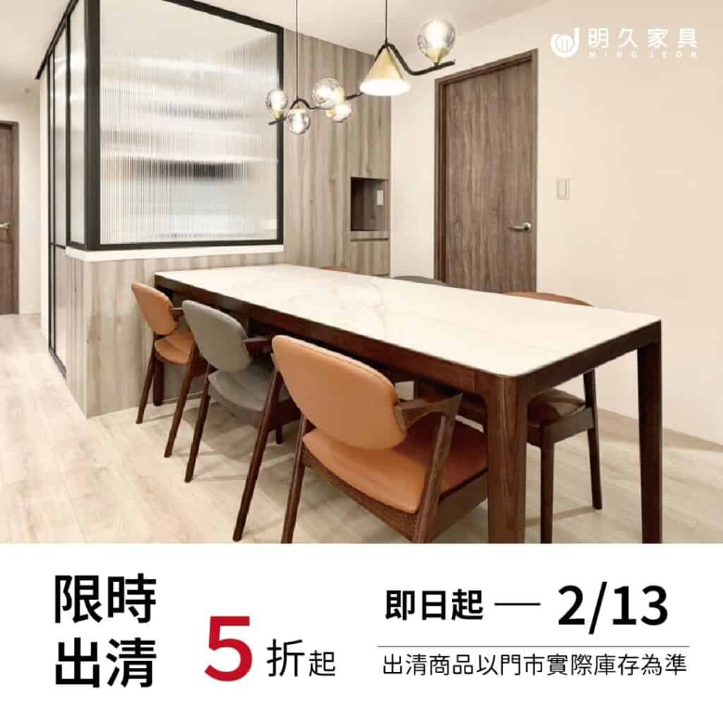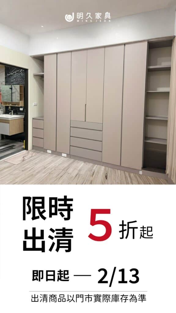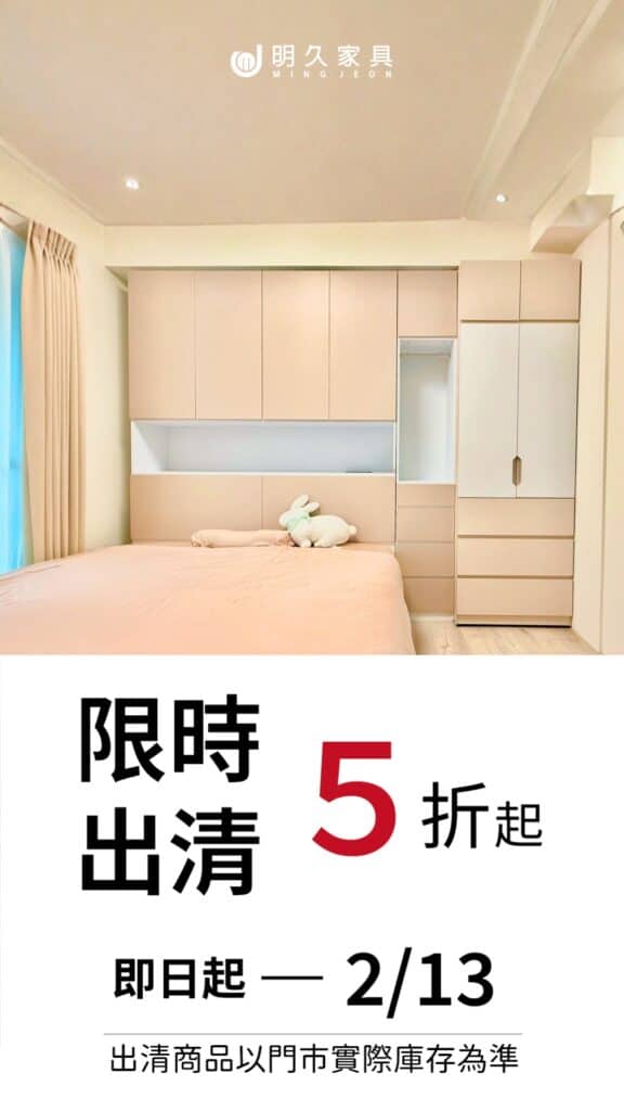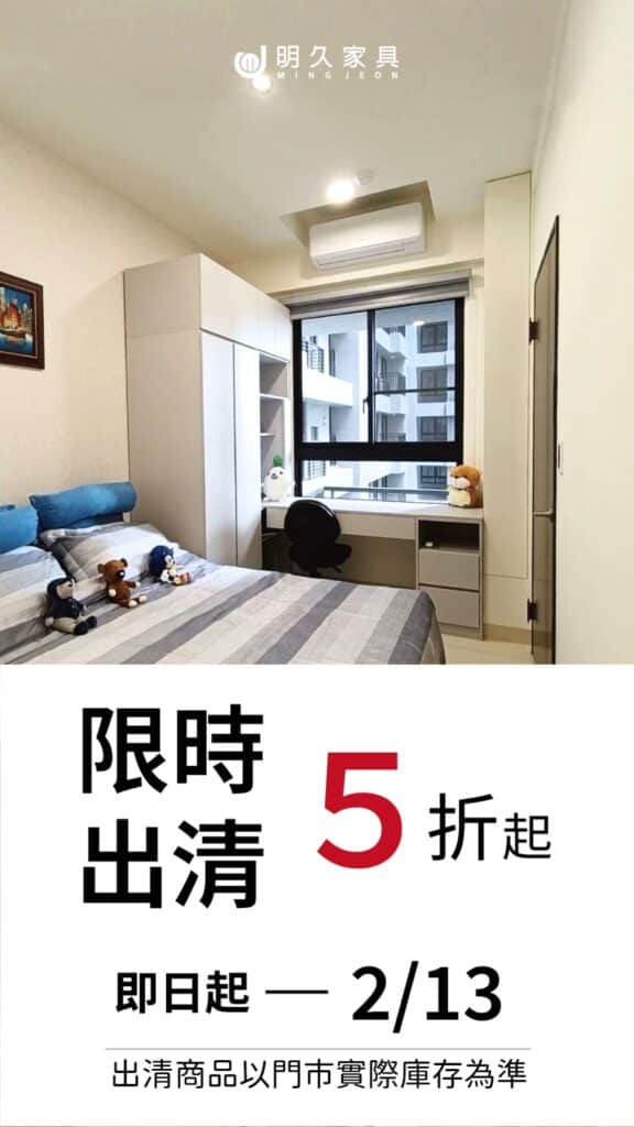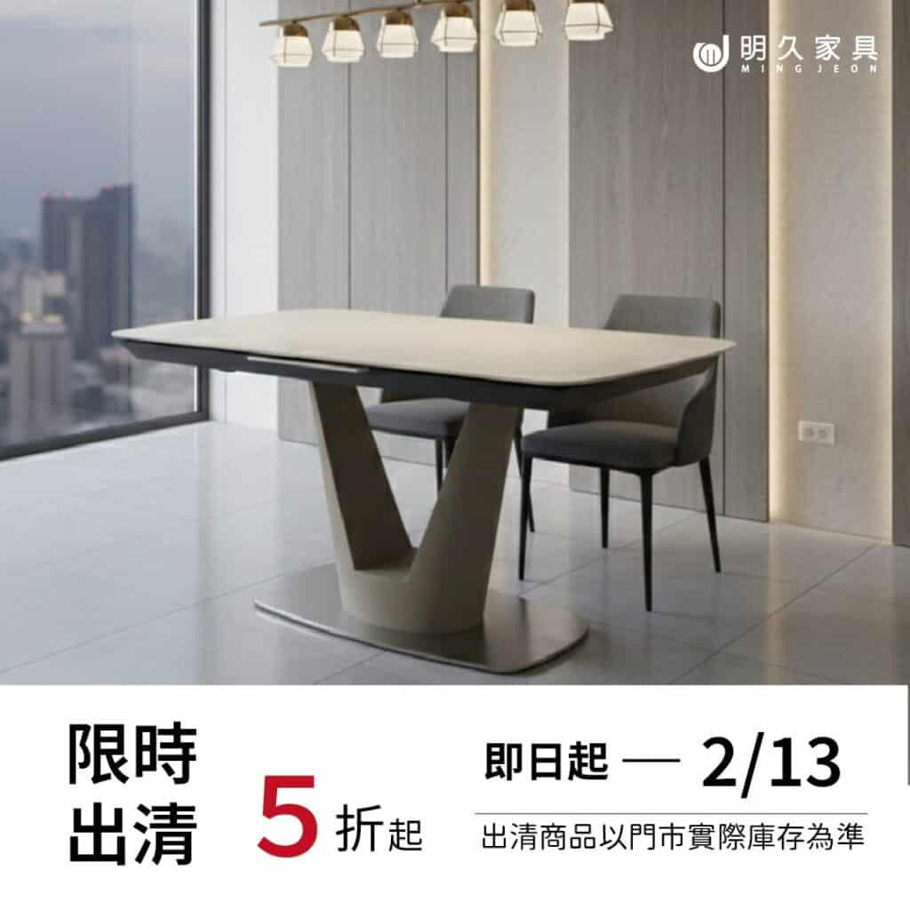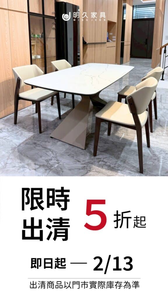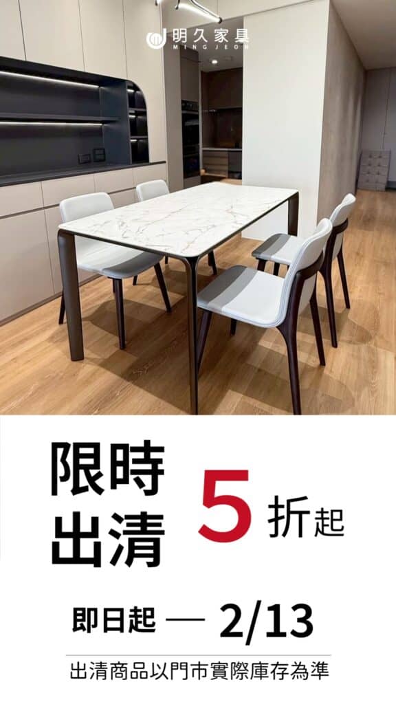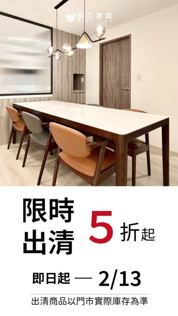 明久家具限時出清活動從即日起至 2026 年 2 月 13 日,全館商品 5 折起。商品以門市實際庫存為準,建議提早前往挑選。