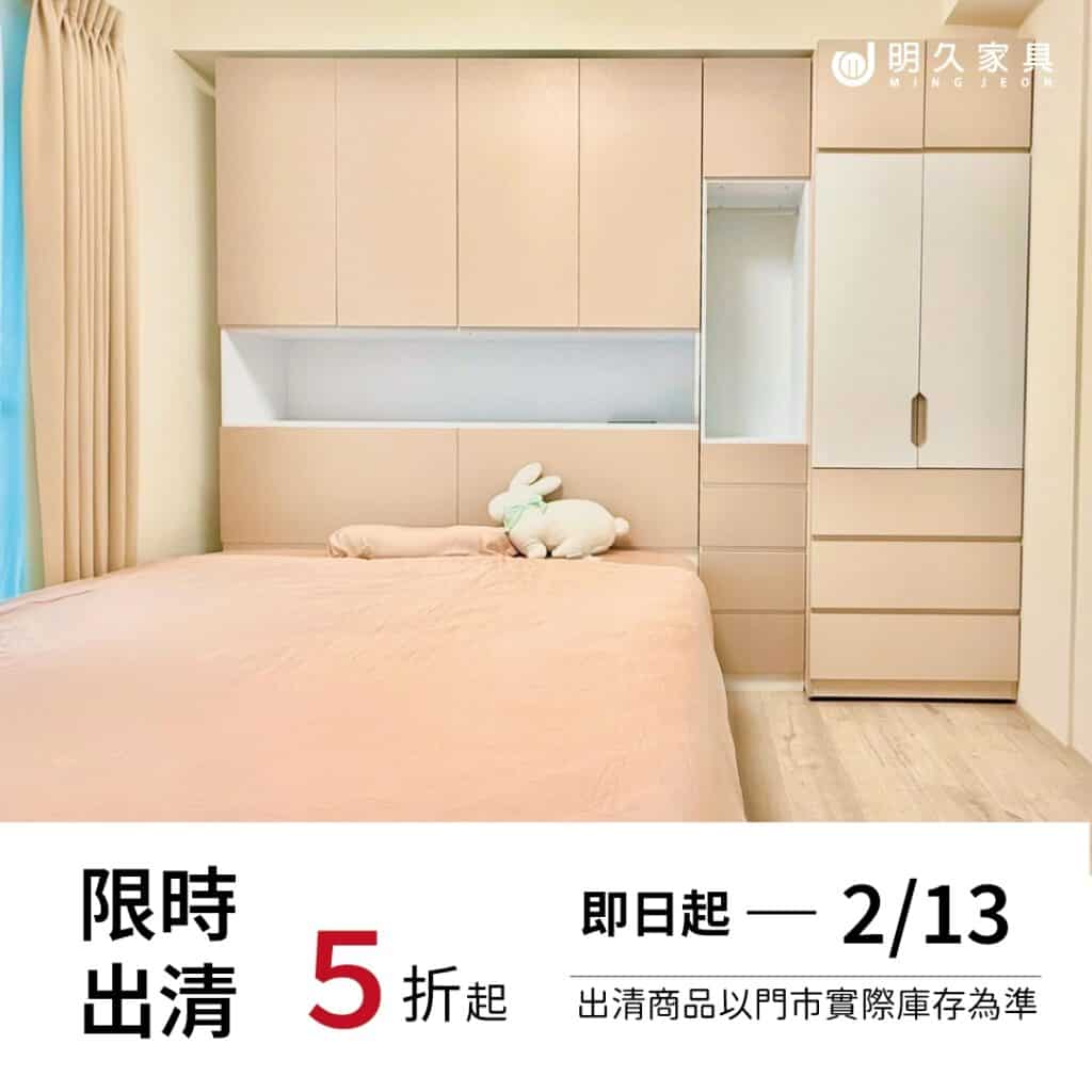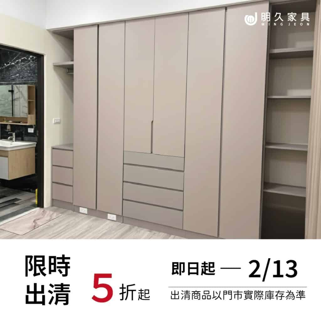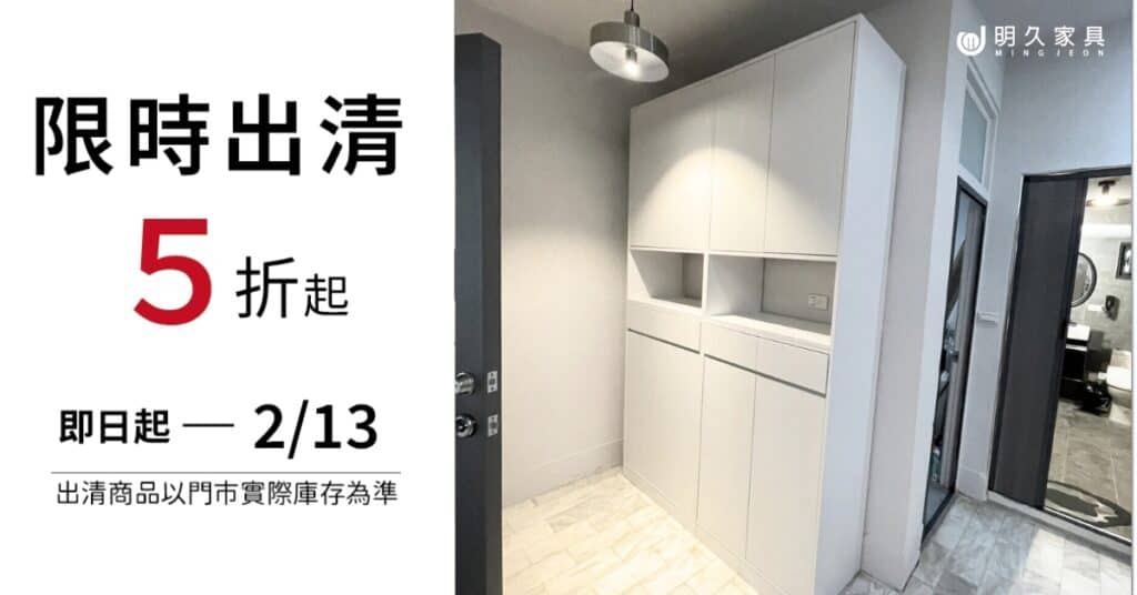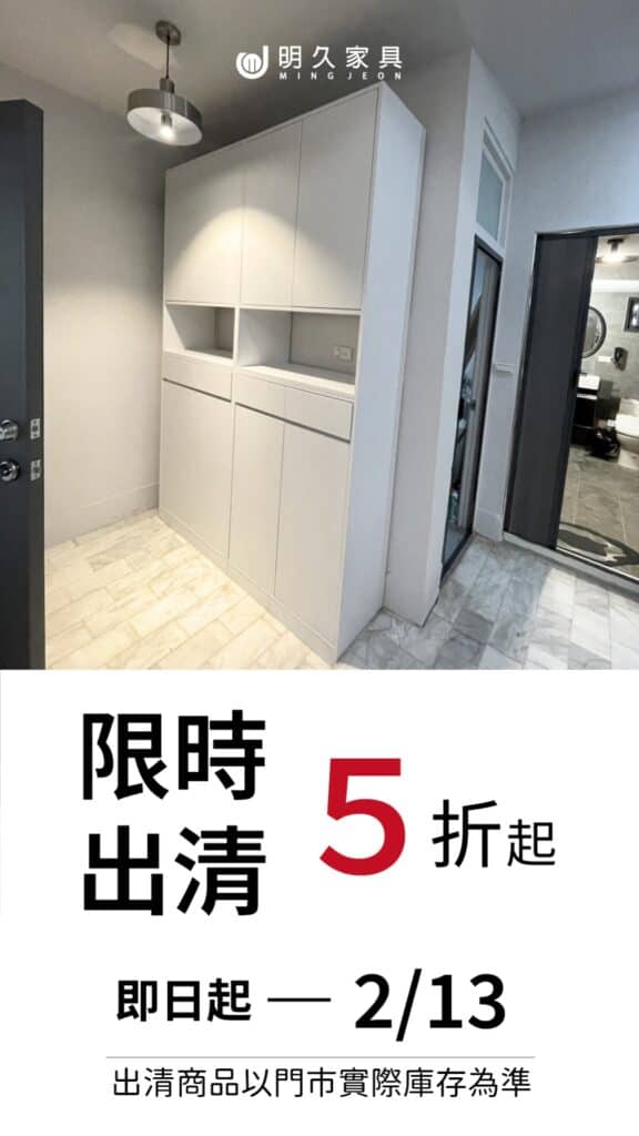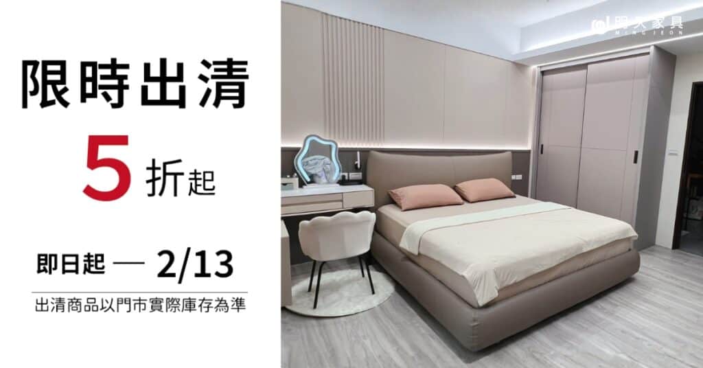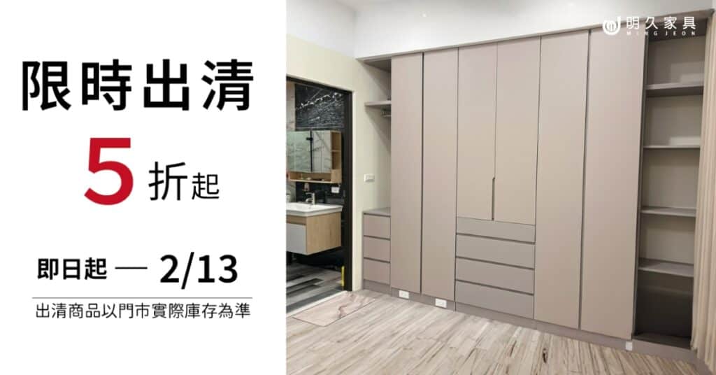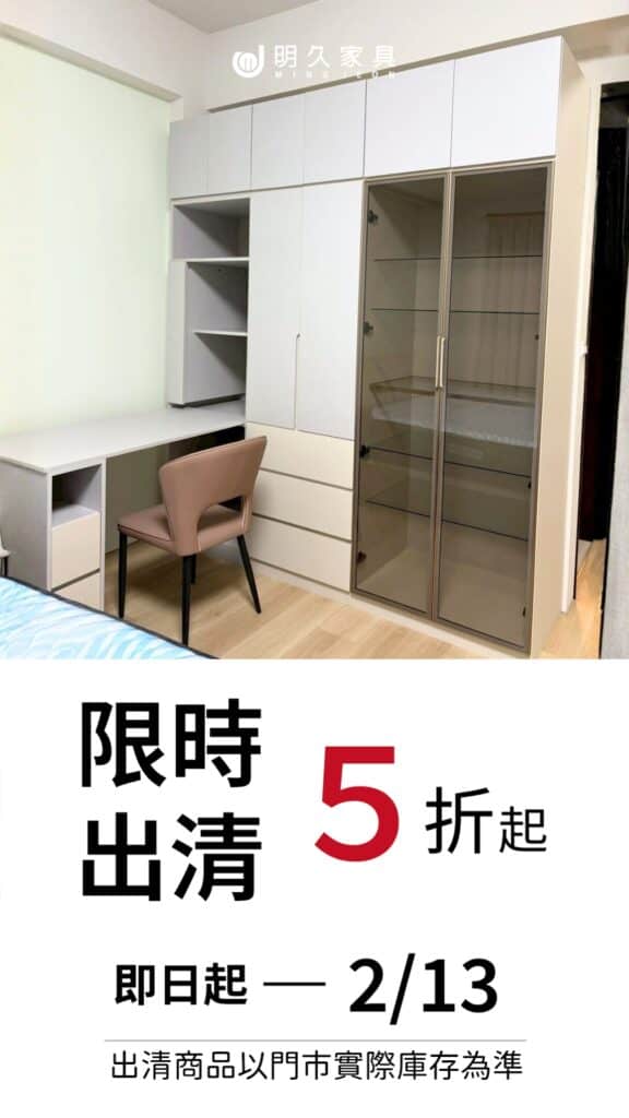 明久家具限時出清活動從即日起至 2026 年 2 月 13 日,全館商品 5 折起。商品以門市實際庫存為準,建議提早前往挑選。