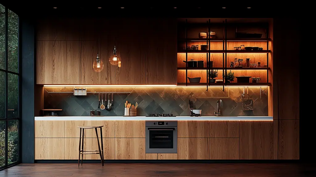 - 採用分層照明,包括檯面工作燈、吊櫃下方的局部燈光及整體環境照明。